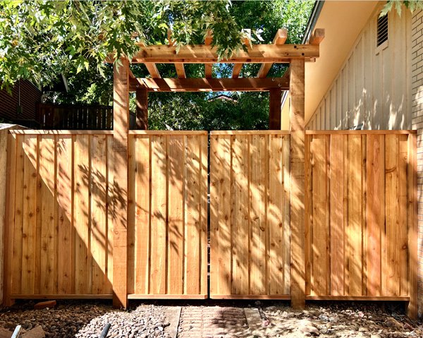 Once we have your fence lines cleared, we’ll mark out the footprint of the new fence and begin setting our fence posts. Properly setting fence posts is arguably the most important step in building a quality fence. The new fence posts are essentially like the foundation of a house – screw up this step, and the entire structure is compromised. For a standard 6′ tall fence, we set our new fence posts at 24″+ deep, which follows the recommended 1/3 depth to post height ratio. We also set our new fence posts in concrete. We use a dry set concrete pouring method, which means initially pouring dry concrete around the post, and then adding water once the posts have been properly plumbed and leveled. The concrete mix we use is designed for this exact method of pouring.