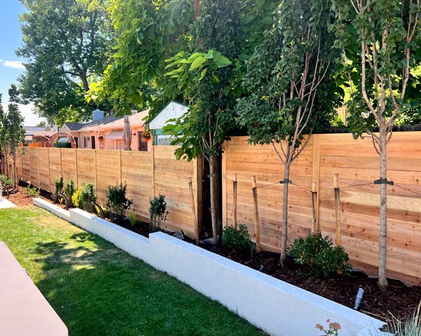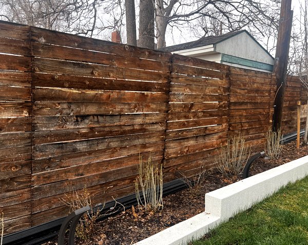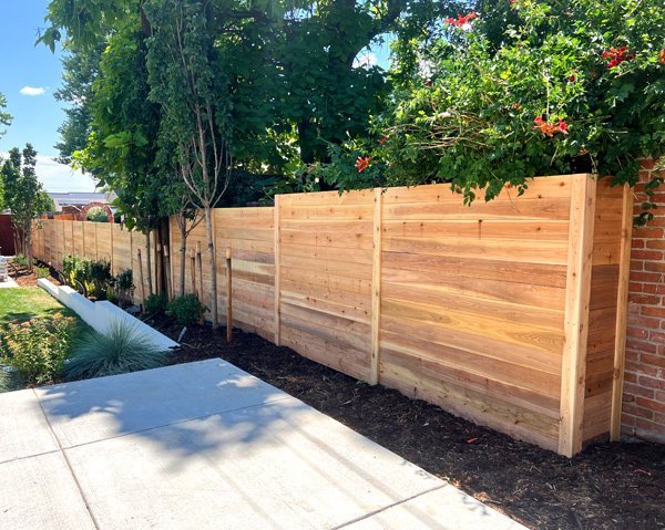 Once the fence posts have been properly set, we have a secure foundation to build off. For a typical vertical picket fence, we install our horizontal rails before attaching our pickets. The 2×4 rails will be screwed to the posts which provides a more secure long term connection between our post and rail. This helps most with high winds that put force on the fence sections. We then nail our pickets to the fence rails using ‘ring shank’ nails. The ring shank nail helps prevent the fence pickets from pulling away over time. A horizontal fence is built a little differently with no use of 2×4 rails, and instead having the pickets span the posts horizontally. We use a vertical ‘runner’ board in the middle of each section to add strength to the section, and to keep our pickets from warping.